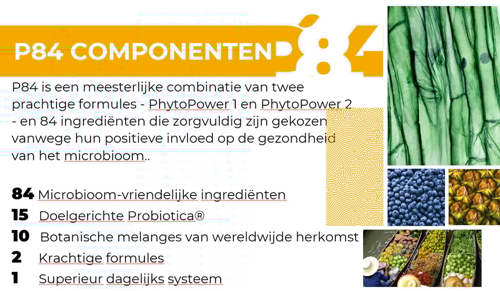 Drink elke ochtend de P84 en je ondersteunt je microbioom dagelijks met 84 planten/vezels.